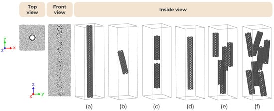 Distinct concentrations of SWCNT fillers have been modeled to investigate the effects of weight percentage (wt.%) and the length of CNT fillers on the mechanical properties of the PE/SWCNT systems under tensile/compressive loading. As illustrated in Figure 3a, a long CNT is considered. Additionally, a shorter version of CNT with a tube length of 150 Å is also examined, as depicted in Figure 3d. Furthermore, one, two, five, and seven CNTs with a tube length of 70 Å have been randomly inserted into the CG PE system, as shown in Figure 3b, c, e, and f, respectively. In all cases, the number of PE chains is adjusted accordingly to maintain a similar density of PE in the systems. Noticeably, only in (a) does the CNT span the whole length of the simulation cell, being infinite in length as a virtue of the periodic boundary conditions.