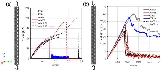 Stress–strain curves obtained for CG and atomistic (AIREBO-AA and Tersoff AA T) ar and zz nanotubes under (a) tensile and (b) compressive loading. CG models are represented by the gray and blue curves, while AA models are represented by the black and red curves and AA T by dashed lines. The black arrows represent the load direction.