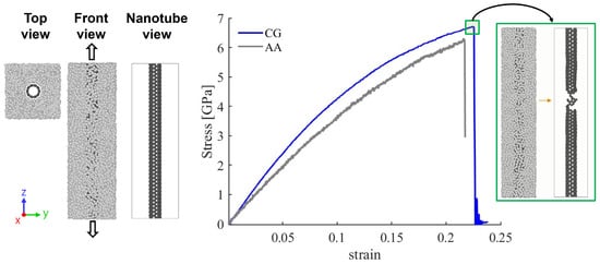 Mechanical response of PE/SWCNTs under tensile loading. On the left, the top and front views of the system are presented with the nanotube positioned inside the matrix. In the middle, a comparison between the stress–strain curves of CG and AA models is presented. The insert at the top of the CG curve highlights the mechanical response of the system at the stress–strain level, as shown on the right.