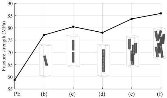 Fracture strength of CG PE/SWCNTs composites under uniaxial tensile loading. The indices (b), (c), (d), (e), and (f) on the x-axes represent the different systems described in Figure 3. In these illustrations, the polymer is removed to facilitate visualization of the nanotubes.