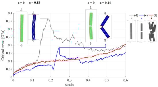 Critical stress–strain of CG models of PE/SWCNTs under compression loading. The gray curve (d) corresponds to the system shown in Figure 3d, the blue curve (c) to Figure 3c, and the red curve (f) to Figure 3f. The insets on the right show the systems. For the gray (d) and blue (c) curves, the fracture patterns of the models are presented for different strain levels.