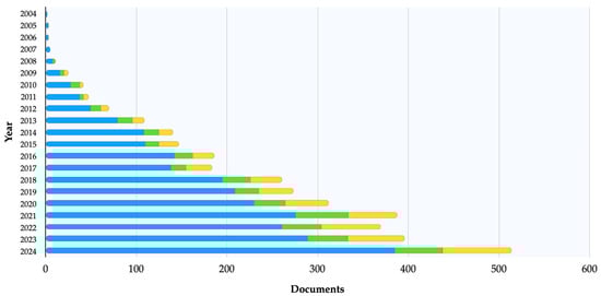 Document counts (n = 3492) on the antimicrobial activity of silver nanoparticles in animals from years 2004 to 2024, obtained using the keywords (silver AND nanoparticles) AND (veterinary OR animal) AND one of the following pathogen-specific terms: for bacteria (blue) using (bacteria OR antibacterial OR bactericidal), for viruses (green) using (virus OR antiviral OR virucidal), or for fungi (yellow) using (fungus OR fungi OR antifungal OR fungicidal). Data were retrieved from Scopus Search (https://www.scopus.com/search/form.uri (accessed on 16 January 2025)). Notably, antibacterial activity has been investigated more extensively than antiviral and antifungal activities.