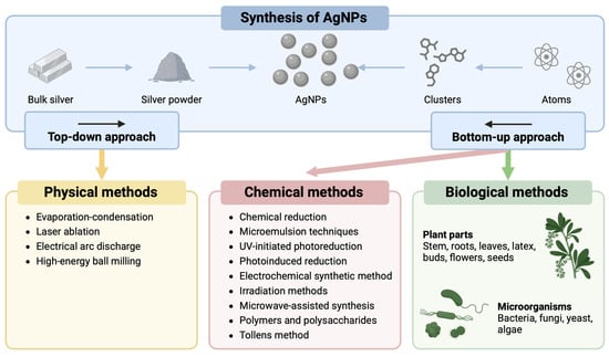 Various methods can be used to synthesize AgNPs, including chemical, physical, and biological synthesis, which are mainly divided into two processes: top-down and bottom-up [14] (Figure 2). The top-down approach—essentially the physical methods— involves the creation of AgNPs from bulk silver by applying various physical forces. This approach allows for the acquisition of pure AgNPs without chemical additives and with a uniform size distribution [15]. The bottom-up approach—mainly the chemical and biological methods—involves the assembly of complex clusters to form AgNPs from molecular components through nucleation and growth processes. While the chemical methods allow for the rapid production of AgNPs, the use of chemical additives could restrict their medical applications [16]. Biological methods have emerged as promising alternatives to address these limitations. This economical, environmentally friendly, simple, and reliable approach uses macromolecules from bacteria, fungi, and algae and organic components from plant extracts [17].