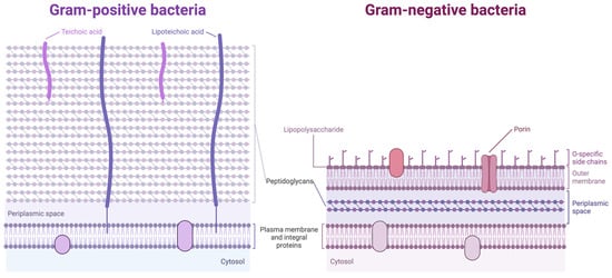 The type of bacteria affects their susceptibility to AgNPs. Gram-positive bacteria are less susceptible than Gram-negative bacteria due to the different organization of peptidoglycans within the cell membrane (Figure 3) [66]. Additionally, the negative charge of lipopolysaccharides within the cell membrane of Gram-negative bacteria promotes the adhesion of AgNPs [67,68]. Both classes of bacteria display, however, complete growth inhibition at higher concentrations [69]. Moreover, surface functionalization with various stabilizing agents or biomolecules could modulate the interaction between AgNPs and bacteria, enhancing their biocompatibility or targeting specific bacterial strains [70]. The antibacterial effect is dose-dependent, with higher concentrations of AgNPs generally leading to more potent antimicrobial activity [71]. However, excessively high concentrations could be toxic to host cells or the environment, necessitating careful optimization in therapeutic applications. Moreover, the antibacterial efficacy of AgNPs could be influenced by factors such as pH, temperature, and the presence of organic matter [72].