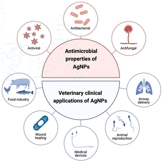 Current clinical applications of silver nanoparticles (AgNPs) in veterinary medicine. As AgNPs exhibit antibacterial, antiviral, and antifungal properties, their use has been investigated for several clinical applications in veterinary medicine.