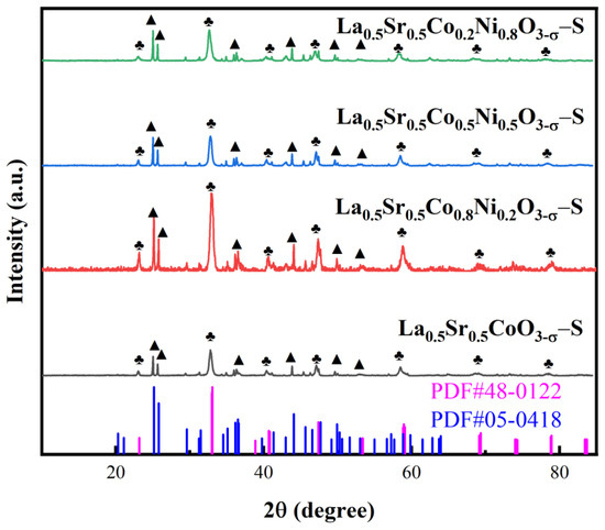 The molar ratio of cobalt and nickel was 10:1. Lanthanum nitrate (5 mmol), strontium nitrate (5 mmol), nickel nitrate (8 mmol), and cobalt nitrate (2 mmol) were dissolved in 80 mL of deionized water. Citric acid (5 mmol) was added, and the solution was ultrasonically dispersed for 10 min. After complete dispersion, a magnetic stir bar was placed in the beaker, which was then positioned on a magnetic heating stirrer rotating at 400 rpm, maintaining a heating temperature of 95 °C. The solution evaporated until it became viscous. Heating and stirring were stopped, and the stir bars were removed once the beaker cooled to room temperature. Subsequently, the beaker underwent further drying in a blast drying oven at 180 °C for 6 h. The dried material was then ground in a mortar and transferred to an alumina crucible, followed by placement in a muffle furnace. The furnace temperature was ramped from room temperature to 750 °C at 3 °C/min, held at 750 °C for 4 h, and naturally cooled to room temperature. This synthesis process was repeated for perovskite materials with x values of 0.5 and 0.8, maintaining consistent conditions, named as La0.5Sr0.5Co0.5Ni0.5O3−δ-S, La0.5Sr0.5Co0.5Ni0.8O3−δ-S, La0.5Sr0.5CoO3−δ-S, and La0.5Sr0.5Co0.2Ni0.8O3−δ-S.