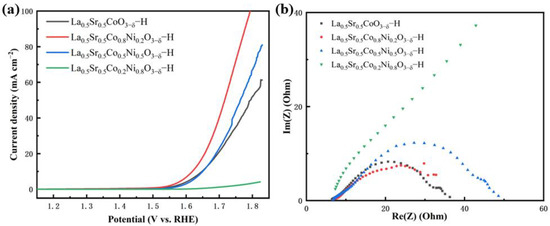 OER tests of La0.5Sr0.5Co1−xNixO3−δ-H. (a) LSV curves, (b) EIS.