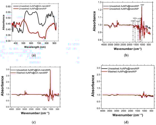 (a) LSPR absorption spectra recorded for unwashed AuNPs@GA-nanoMIP and AuNPs@nanoNIP. (b) ATR-FTIR recorded for (b) unwashed AuNPs@GA-nanoMIP compared to unwashed AuNPs@nanoNIP, (c) unwashed AuNPs@GA-nanoMIP compared to washed AuNPs@GA-nanoMIP and (d) unwashed AuNPs@nanoNIP compared to washed AuNPs@nanoNIP.