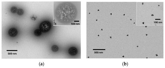The ATR-FTIR spectra of unwashed nanoMIPs compared to the control are shown in Figure 1b. The bands located in the region between 3700 and 2700 cm−1 are present for both nanomaterials, indicating characteristic peaks of acrylate-based polymers. For the polymer control, typical bands of poly-NIPAM-co-AAc are visible: the bands at 1175 and 1047 cm−1 are attributed to C-O, C-O-C and C-OH stretching [51]. The characteristic -C=O stretching vibration band for amine II [52] is visible at 1539 cm−1. Finally, the poly-NIPAM structure is also confirmed by the peak at 1343 cm−1, which is attributable to the branch -CH(CH3)2 group. In the case of nanoMIPs, a low-intensity band at 1728 cm−1 is visible, which can be attributed to the carboxyl group of AAc [53]. Thus, it was confirmed that the imprinting process was successful. In addition, the intensity of the peak at 1721 cm−1 related to the AAc structure increases compared to that of the nanoNIP, suggesting that the contribution is due to the binding with the template. In the case of nanoMIPs, the intensity bands in the region of 1300–1000 cm−1 were modelled, indicating structural changes in the polymer, which ultimately led to target removal (Figure 1c). In the case of the AuNPs@nanoNIP, in the spectra obtained before and after the treatment, as expected, no visible changes occurred (Figure 1d). The DLS results estimated a particle size diameter between 100 and 300 nm, with a PDI at 0.265 (Figure S4), indicating that the particles are homogeneous and uniformly distributed. The TEM image (Figure 2) for the nanoMIPs shows well-dispersed particle morphologies, with a similar spherical shape about 250 nm in diameter, which results in good agreement with the first estimation from the DLS results.