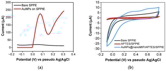 The CV of the SPPtE in PBS at pH 7.4 did not show any significant electrochemical activity in the range from −0.2 V to 0.4 V vs. pseudo-Ag|AgCl, as expected. The addition of AuNPs produced a high-intensity DPV response peak at a potential of +0.07 V vs. pseudo-Ag|AgCl, which is attributed to the oxidation of gold at the electrode surface [59]. These results were confirmed by the CV characterisation obtained for the APTES/SPPtE and after AuNPs@GA-nanoMIP immobilisation. No evident electroactivity was recorded after APTES modification (red line) compared to the bare electrode. The integration of AuNPs@GA-nanoMIPs led to a significant increase in the current with respect to the APTES electrode, improving the electron transfer at the SPPtE surface. The observed CV results for the AuNPs@APTES/SPPtE represent the reversible reaction during the oxidation/reduction of Au observed at +0.07 V and −0.1 V vs. Ag|AgCl, respectively [60], making the nanoparticles electroactive. This means that the detection mechanisms at the cavities are strongly influenced by the electroactivity of Au.