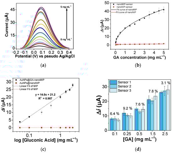 Figure 4a shows the affinity of the proposed sensor for GA. In fact, the peak currents at 0.07 V vs. Ag|AgCl increase with increasing concentrations of GA up to 5.0 mg/mL. As aforementioned, the presence of GA molecules in the MIP provides pathways for electron transfer, enabling redox conversion at the capped AuNPs [26], possibly through the template interaction within the recognition cavities by hydrogen bonding and shape complementarity. Furthermore, the presence of the tightly bound AuNP–polymer composite resulted in higher DPV current responses to nanoMIPs than the control. As a comparison, the DPV responses to GA of AuNPs@nanoNIP are shown in Figure S6. Furthermore, the calibration curve obtained for the imprinted nanoparticles via DPV measurements versus analyte concentration shows two linear regions (Figure S7). This behaviour can occur when a wide concentration range is tested and is typical for systems based on molecularly imprinted polymers, as reported in several previous publications [61,62,63,64].