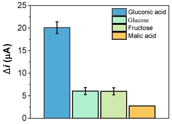 The selectivity towards structural and competitive interferents of GA of the AuNPs@GA-nanoMIP sensor was investigated. The glucose molecule was chosen as a molecule of structural similarity, and fructose and malic acid were chosen as common organic compounds that are found in real wine samples. At a fixed concentration of 1 mg/mL, five different sensors were prepared and tested against these compounds. In general, the response of the AuNPs@GA-nanoMIP sensors to the studied interferents show negligible effects, as shown in Figure 5, where the responses at 1 mg/mL are represented. At lower concentrations, the responses of the nanoMIP-based sensor against the interferents are minimal (Figure S8).