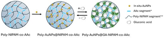 A possible reaction scheme during the formation of AuNPs@GA-nanoMIPs is shown. The sensing mechanism may involve an ON–OFF response triggered by the swelling behaviour of NIPAM upon molecule recognition (* AAc: acrylic acid; ** Poly-NIPAM: poly(N-isopropilacrilammide)).