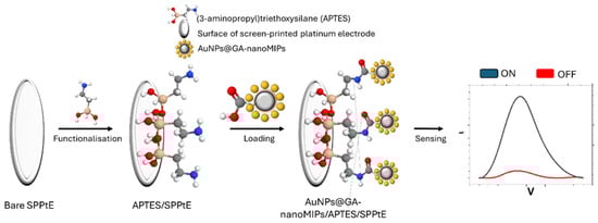 A bare SPPtE was chosen for the preparation of the electrochemical sensor. Prior to modification, the electrode was rinsed with ethanol and dried. Subsequently, 5 µL of an ethanolic solution of APTES was drop-cast for 10 min to obtain APTES/SPPtE via the covalent bond between the silane and the Pt material [56]. A concentration of 5% v/v 3-aminopropyltriethoxysilane (APTES) in ethanol demonstrated effectiveness for the functionalisation of the screen-printed electrode when considering the Rct obtained by EIS measurements (Figure S5). APTES/SPPtEs have primary -NH2 groups available for further chemistry. Consequently, the prepared AuNPs@GA-nanoMIPs were attached to the electrode surface by the EDC/NHS coupling reaction [57,58], resulting in a stable amide bond.