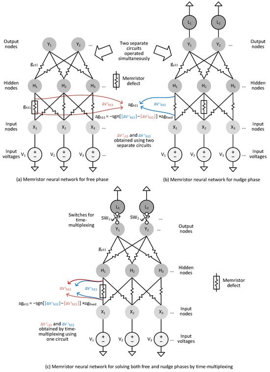However, still, memristor fabrication techniques are not mature even today; therefore, they may have some issues of defects and variability [27,28]. Considering the memristor’s defects and variability, the separation of free-phase and nudge-phase circuits can cause a serious degradation of the neural network’s performance. If the memristor circuit for solving the EP’s dynamic equation in the free phase is different from that of the nudge phase, the two separate circuits may suffer different defects and variability. If so, as they are trained by local learning, the two separate synapses implemented by two different memristors may suffer the problems of defects and variability more severely.