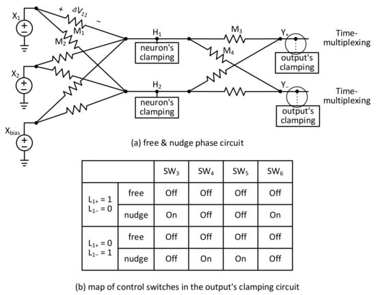 As shown in Figure 2a, if the EP algorithm is solved separately using the two memristor circuits, the free-phase and nudge-phase solutions can be affected by different defects and variability due to the two different memristor crossbars of free and nudge phases. To avoid this problem, a time-multiplexing technique can be considered to solve the EP dynamic equation of free phase and nudge phase using only memristor crossbar one by one. To do so, Figure 3a shows a time-multiplexed memristor circuit for solving EP’s dynamic equation in the free and nudge phases sequentially. Here, X1 and X2 are input voltages. Xbias means a bias voltage. H1 and H2 represent hidden node voltages. Unlike Figure 2a, the hidden nodes are common to both the free and nudge phases in Figure 3a. Y1+ and Y1− are positive and negative output nodes, respectively. M1 and M2 are synaptic weights between the input and hidden neurons in Figure 3a. M3 and M4 represent synapses between the hidden and output neurons. Here, when the free-phase solution is calculated, the output clamping circuit is disconnected from the output nodes. On the contrary, the output’s labels are connected to the output nodes for solving the nudge phase’s equation. The switching between the free and nudge phases is performed by controlling the switches in the output’s clamping circuit, as explained in the following.