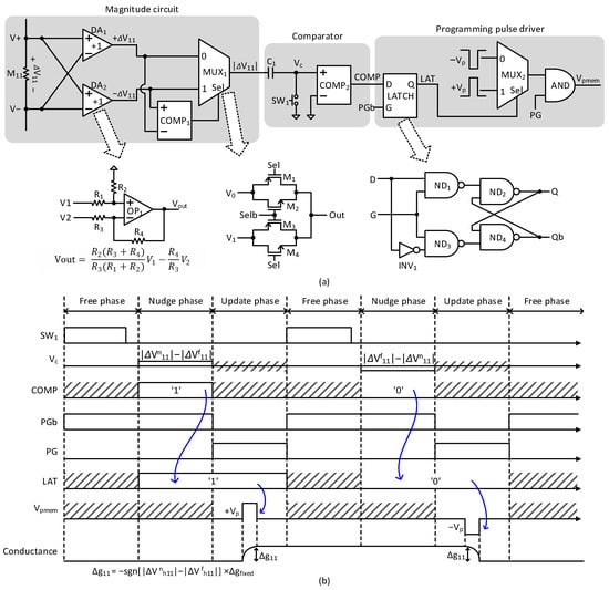 In the free phase, the magnitude circuit delivers |ΔVf11| to C1. At this time, it should be noted that ‘Vc’ is zero because SW1 is turned on. In the following nudge phase, the magnitude circuit delivers |ΔVn11| to C1. In this case, ‘Vc’ becomes as high as |ΔVn11| − |ΔVf11| because SW1 is turned off in the nudge phase. COMP2 compares ‘Vc’ with respect to 0V. Thus, if ‘Vc’ > 0, COMP2’s output becomes high. If ‘Vc’ < 0, COMP2’s output becomes low. The comparator’s output is latched when ‘PGb’ is low. The latched output signal of LAT selects a positive or negative programming pulse by MUX2. The positive and negative programming pulses are represented by ‘ + Vp’ and ‘–Vp’ in Figure 4a, respectively. The MUX2’s output and ‘PG’ enter the AND gate. By doing so, the programming pulse can be applied to memristor synapses only when ‘PG’ is high. If ‘Vpmem’ is positive, the memristor’s conductance is increased. On the contrary, if ‘Vpmem’ is negative, the memristor is programmed to decrease its conductance.