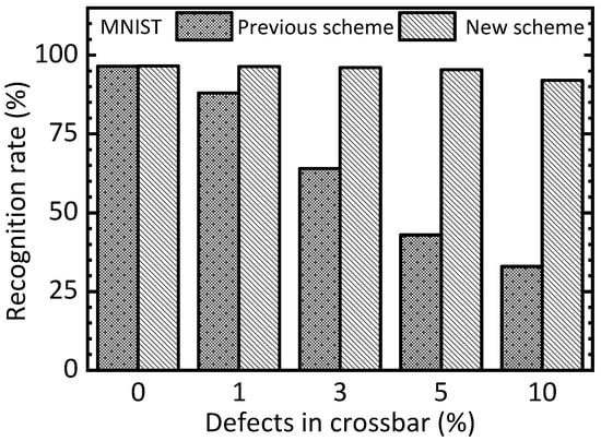 The simulated MNIST recognition rate of the previous and new schemes with increasing the percentage of defects in the memristor crossbar.