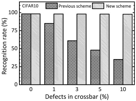 The simulated CIFAR10 recognition rate of the previous scheme and the new one in terms of increasing the defect percentage in the memristor crossbar.