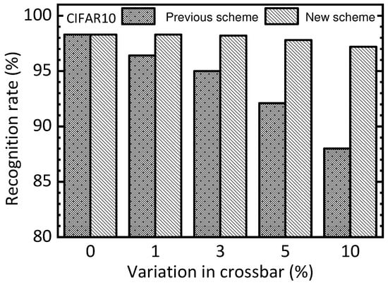 Figure 9 compares the previous scheme and the new one for the CIFAR10 test dataset in terms of increasing the variation percentage in the crossbar. When the variation percentage is zero, both the previous and new schemes show a recognition rate of 98.3%. When the variation becomes as high as 10%, the previous scheme and the new one are 88% and 97.2%, respectively. Similar to Figure 8, Figure 9 demonstrates obviously that the new scheme can be more robust in terms of device variation than the previous one.