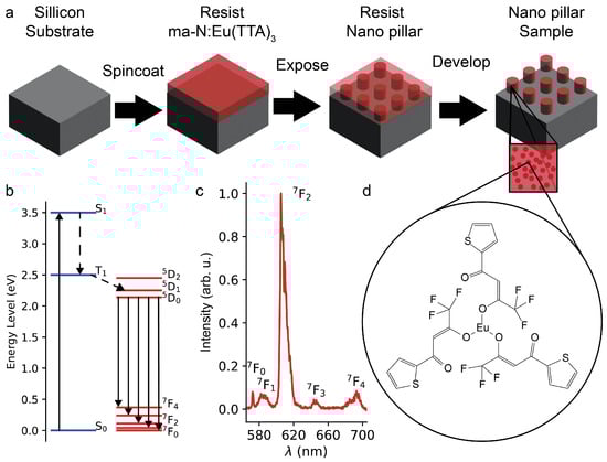 Specifically, we demonstrate the deterministic fabrication of fluorescent nano- and microstructures by directly exposing a Eu3+-doped resist with electron-beam lithography, as shown in Figure 1a. The fabrication scheme thus inherits the full structural flexibility and placement accuracy from the employed electron-beam lithography (EBL) process, including the capability for precise integration into nanostructures via precision-aligned two- or multistep EBL procedures []. For a more comprehensive review of EBL we refer the reader to review papers by A. A. Tseng [] or Y. Chen []. Eu3+ is particularly suitable for studying MD transitions as the Eu3+(5D0) ⟶ Eu3+(7F1) transition occurs in the visible wavelength () at . Eu3+ also features several ED transitions, with Eu3+(5D0) ⟶ Eu3+(7F2) at being the dominant one [].
