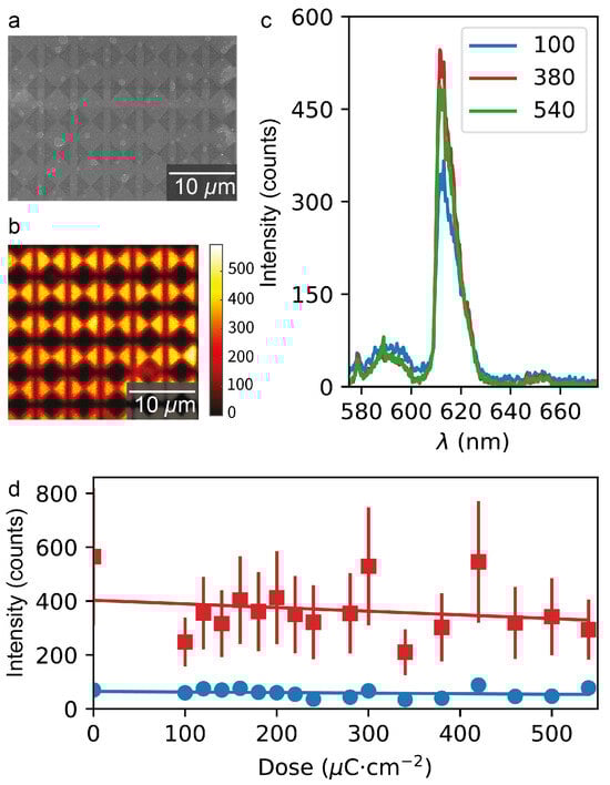 Next, to investigate the fluorescence spectra of the sample, the microscope output was coupled to a spectrometer (Oxford Instruments, Belfast, Northern Ireland: Andor Kymera 328i) equipped with a camera (Andor Newton) to record the signal. Figure 2c shows the measured spectra of the structures fabricated, similar to the structures in Figure 2a, with exposure doses of 100 , 380 , and 540 . The signals are not corrected for background noise. Notably, while the peak intensity varies for the different structures, a systematic dependence of the fluorescence signal on the exposure dose is not apparent. Furthermore, the spectral position of the fluorescence maximum is not affected by the exposure for any of the considered dose values. Importantly, and in contrast to [], we do not detect any parasitic emission from the resist at the excitation powers used in this experiment.