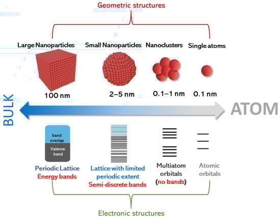 Despite this operational distinction, the physical configuration, and, often, the chemistry and synthesis, of SACs and SACCs may follow similar rules. As shown in Figure 1, in the case of adatoms that are only metal atoms (i.e., not oxides), precise control of their aggregation state is essential for regulating their electronic properties [18,19,20,21]. It is important to notice that, in contrast to previous similar schemes in the literature on the effect of size on electron levels [22,23,24,25,26], in Figure 1, we emphasize the cases of nanoclusters, small nanoparticles, and larger nanoparticles as pertinent configurations that conceptually should be anticipated to be between single atoms and bulk materials. Also, it should be noted that the term “large nanoparticles” herein is used to signify that for nanosizes near 100 nm, the electronic properties, e.g., density of states, do not exhibit quantum-sized effects [27]. Thus, we use the term “large nanoparticles” to highlight that, even if these structures are in the “nanoscale”, their properties might tend to resemble those of bulk particles. On a rigorous basis, all these trends can be well documented by theoretical quantum computing tools. However, herein, we present only a conceptual analysis, based on the fundamental concepts of nanoscale solid-state physics [28].