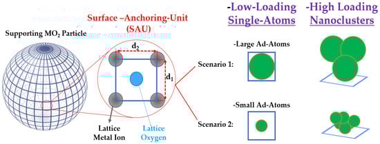 To illustrate this, Figure 2 depicts an ideal spherical particle whose surface is divided into “surface-anchoring-unit” (SAU). In a typical metal oxide, ad atoms preferentially anchor to the oxygen (O) atoms of the lattice. On a simple MO2 oxide surface, four metal atoms (M) frame each O atom, defining a SAU that spans an elementary surface of 0.1 to 1 nm2, i.e., based on typical atomic diameters of 1–3 Å and M–O bond lengths of 1–2 Å. In this configuration, if one SAU binds one ad atom, that constitutes the single atom scenario; if the number of ad atoms per SAU exceeds one, clusters will inevitably form. In this context, the size of the ad atom itself (see Table 1) will dictate how many atoms can be accommodated at a minimum in a small nanocluster per SAU.