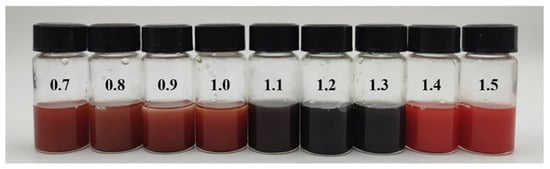 Figure 2. Picture of HgS synthesized with different proportions of S (S/HgCl2 from 0.7 to 1.5).