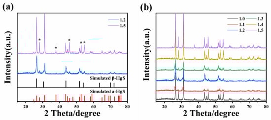 Figure 4. (a) Comparison of prepared α-HgS and β-HgS with XRD standard cards; (b) XRD plots of different ratios of HgS. The asterisks are used to highlight the peaks.