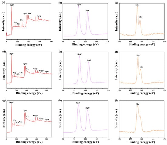 Figure 5. (ac) are the XPS profiles of α-HgS-1.0 particles (a), Hg4f (b), and S2p (c), respectively; (df) are the XPS profiles of α-HgS-1.5 particles (d), Hg4f (e), and S2p (f), respectively; (gi) are the XPS of β-HgS-1.2 particles (g), Hg4f (h), and S2p (i), respectively.