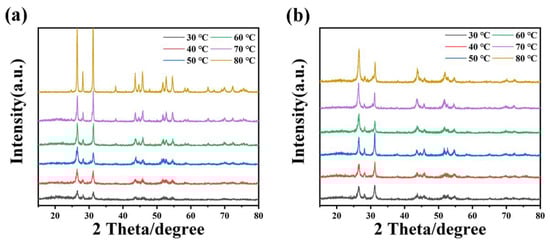 SEM and XRD analyses were conducted of HgS synthesized at various temperatures. Figure 6a–f indicate that with the increase in the reaction temperature, the average particle size of β-HgS-1.2 gradually increases, and uniform spherical particles are formed at 80 °C. The values of the XRD peak height varying with the reaction temperature are shown in Table S2 and Figure 7. As the reaction temperature increases, the height of the diffraction peaks increases, and the highest diffraction peak intensity is presented at 80 °C. Thus, the more uniform the grain size and the more regular the morphology, the higher the intensity of the XRD peaks.