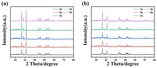 Upon completing our experimental investigations, black β-HgS was synthesized at an S/HgCl2 ratio of 1.2, whereas α-HgS was obtained at ratios of 1.0 and 1.5. Recent studies employing various spectral techniques have identified calomel and elemental Hg particles in deteriorated segments of wall paintings [28,29]. Several hypotheses propose that mercury loss may contribute to changes in the aesthetic appearance of mural paintings, with the displaced mercury reacting with other substances to form various mercury compounds [39,40,41]. We postulated that changes in the S and Hg ratio within the original α-HgS of the murals over time resulted in the formation of black β-HgS. Given that the synthesis ratio of β-HgS lies between that of α-HgS, two conversion strategies were proposed to facilitate the transformation of β-HgS to α-HgS for the restoration of the mural’s original color: Black β-HgS generation results from the loss of either S or Hg, prompting individual experimental exploration of these two transformation strategies.