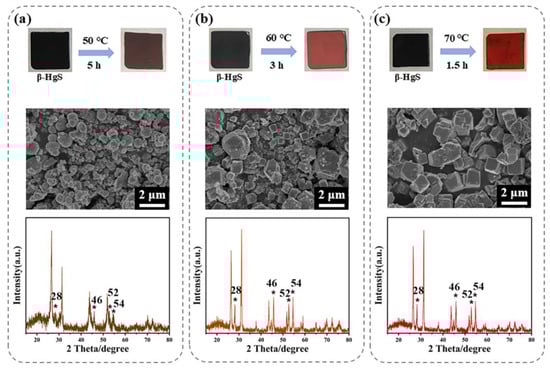 Figure 14. Conversion of β-HgS to α-HgS in mock-up painting samples on calcium sulfate substrates. Color changes and SEM and XRD images of HgS at different transformation temperatures: (a) 50 °C; (b) 60 °C; (c) 70 °C. (The asterisks are used to highlight the four peaks at 28, 46, 52, and 54.)