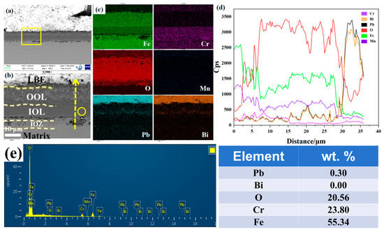 Cross-sectional SEM results of the sample after 1000 h of corrosion at 500 °C: (a) morphology in backscattered electron (BSE) mode; (b) magnification corresponding to the yellow box in (a); (c) EDS mappings of Fe, Cr, Mn, O, Pb, and Bi corresponding to (b); (d) EDS line scan of Fe, Cr, Mn, O, Pb, and Bi along the yellow arrow in (b); (e) Point energy spectrum analysis corresponding to the yellow circle position in Figure 2a.
