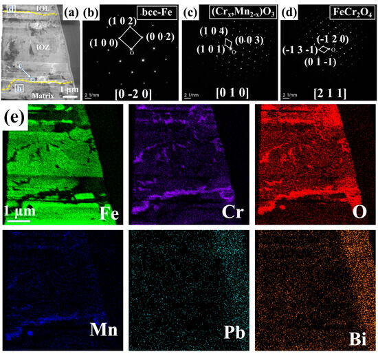 Figure 3 presents the BF model morphology, SAED pattern images, and EDS mappings of FIB1 under TEM observation. As shown in Figure 3a, even the FIB1 sample extracted from the non-porous area contains a small number of pores, which is also reflected in the morphology depicted in Figure 2c. SAED analysis was conducted at various locations on the sample, as illustrated in Figure 3b–d. Combining these results with the element mappings in Figure 3e, we can identify Fe with a bcc structure at location b (PDF#50-1275), Cr2O3 with Mn at location c (PDF#38-1479), and FeCr2O4 at location d (PDF#24-0511). Notably, Cr2O3 forms a coherent layer approximately 0.3 μm thick along the junction of the IOZ and the matrix, with negligible O element present beneath this layer, while there is a partial enrichment of O and Cr on it. Given that the signals for Pb and Bi are weak and the rightmost position corresponds to noise during energy spectrum acquisition, this indicates that there is essentially no Pb infiltration in the non-porous IOZ region.