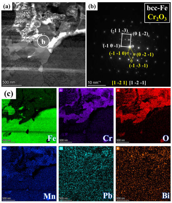 Figure 4 presents the BF model morphology and EDS mappings of FIB2 under TEM observation. Figure 2b illustrates that the porous regions contain minimal Fe elements, yet are abundant in Cr, Mn, and O elements, along with some Pb infiltration. Additionally, a region rich in Cr, Mn, and O is observed at the junction of the matrix and the IOZ, which aligns with the findings presented in Figure 3e. The further amplification of various regions depicted in panel a is shown in Figure 4c–h, utilizing BF and DF image comparisons to assess the presence of precipitated phases. Numerous acicular precipitates are identified within both the matrix and porous regions, along with many fine grains in the porous area. A more detailed examination of the O/M junction, as illustrated in Figure 5, corresponds to the yellow box area in Figure 4a, revealing the presence of numerous pores and fine grains at the junction. Additionally, SAED analysis was conducted on region b, with the results presented in Figure 5b. The calibration results, combined with the energy spectrum data in Figure 5c, indicate that the phase present is Cr2O3 and bcc-Fe. It is evident that the Fe content in the porous region is low, primarily enriched with Cr, Mn, and O, along with evidence of Pb and Bi infiltration.