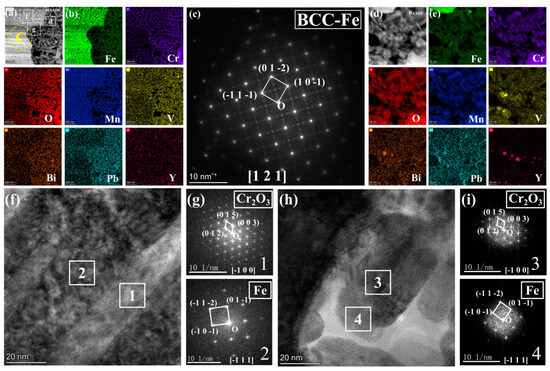 (a) corresponds to the magnified HAADF image shown in Figure 4c; (b) EDS mappings of Fe, O, Mn, Cr, and Pb for (a); (c) presents the SAED pattern image for region b of a; (d) illustrates the enlarged HAADF image of region d of a; (e) EDS mappings of Fe, O, Mn, Cr, and Pb for (d); (f) includes the HRTEM image corresponding to region f in a; (g) provides the FFT pattern images for regions 1 and 2 in f; (h) displays the HRTEM image corresponding to region g in a; (i) presents the FFT pattern images for regions 3 and 4 in h.