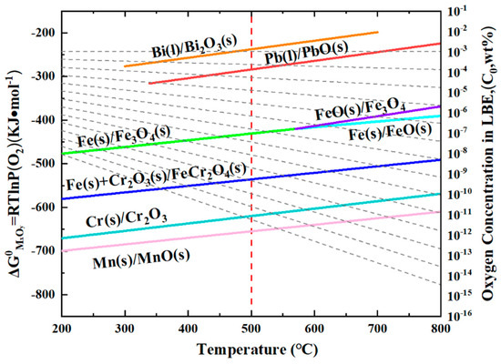 Ellingham diagrams of the standard Gibbs free energy of the concentration of dissolved oxygen in liquid LBE [37].