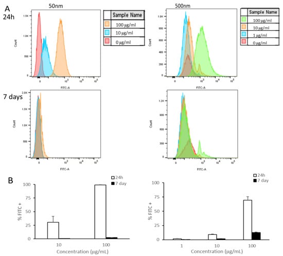 As shown, the smaller PS particles accumulated in cells after exposure for 24 h (Figure 2). Using flow cytometry, we examined if cells were able to remove these particles or if they were being retained by the cells. We observed a reduction in the amount of fluorescent signal in cells cultured for a subsequent 6 days in PS particle-free media after 24 h of exposure to PS particles (Figure 3). Remarkably, Caco-2 cells treated with 50 nm PS-NPs showed a clearance of >95% (Figure 3B). In contrast, Caco-2 cells retained <15% of the 500 nm beads at the highest concentration (Figure 3B).