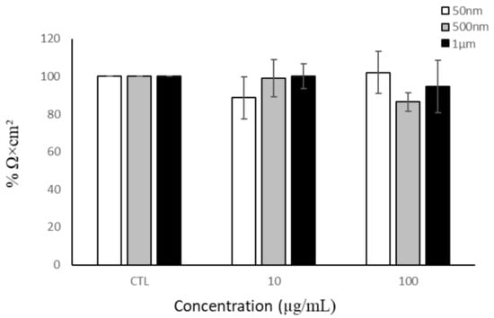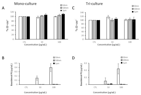 As particles have been shown to translocate across the intestinal barrier, they could potentially activate intestinal macrophages, which may further produce factors that impact barrier integrity. Therefore, we examined the impact of THP-1 cells on barrier integrity. We added 50 nm, 500 nm, and 1 µm PS particles to the basolateral compartment of the tri-culture model. After 24 h of exposure, the TEER values were measured. THP-1 cells exposed to NP/MP particles for 24 h had no significant impact on the Caco-2/HT29-MTX monolayer integrity (Figure 6).