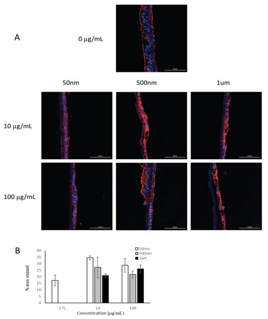To investigate the possible effects of PS particle exposure on mucus production, mucus was stained with wheat-germ agglutinin (Figure 5). Our results showed that there was no reduction in the mucus layer due to PS particle exposure after 24 h (Figure 5B).
