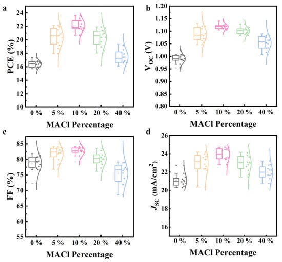 Statistical distribution of (a) PCE, (b) Voc, (c) FF, and (d) Jsc of PSCs with different percentages of MACl additives.