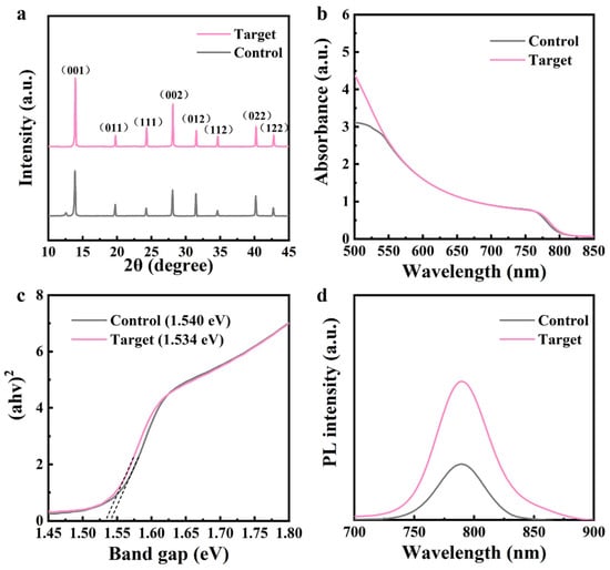 (a) XRD spectra, (b) absorbance spectra, (c) Tauc plots, and (d) PL spectra of control and target perovskite films.
