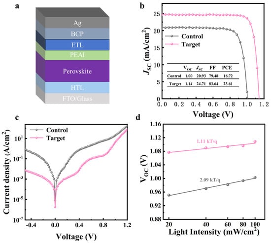 (a) Diagram of structure of PSCs; (b) J-V curves of best-performing target PSCs fabricated with 10% MACl additive and control device; (c) dark current curves of control and target PSCs; (d) light intensity dependence of Voc of control and target PSCs.
