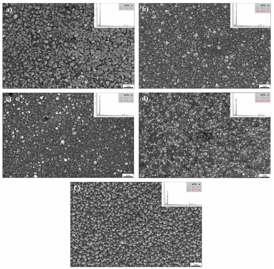 Hagarova M et al. [97] investigated the electrodeposition of nickel–cobalt alloy coatings onto copper substrates from a sulfate bath, and their study revealed significant changes in the coatings’ properties as the cobalt sulfate concentration in the electrolyte was varied. As Figure 6 shows, they noted that the cobalt concentration in the coatings rose as the cobalt sulfate concentration in the solution was elevated, with the cobalt content rising from 31.8 wt.% to 49.2 wt.% when the concentration of CoSO4 in the electrolyte was adjusted from 20 g/L to 45 g/L. As the amount of cobalt in the electrolyte increased, there were distinct changes in both the texture and size of the grains. These alterations in the coating’s microstructure were strongly associated with the increasing cobalt content, suggesting that the cobalt concentration is a critical factor in controlling the morphological features and the overall grain structure of the alloy coatings. In particular, as the cobalt content increased, the coatings exhibited a finer grain structure, which is known to contribute to enhanced material properties such as hardness and wear resistance. Moreover, the electrodeposited nickel–cobalt alloy coatings’ hardness was directly influenced by the cobalt concentration in the plating solution. The interaction between the cobalt concentration in the sulfate bath and the coatings’ hardness, as measured by the Vickers hardness (HV0.1), was examined and showed that the highest hardness value of 556.3 HV0.1 was achieved at a cobalt content of approximately 42.6%, corresponding to a CoSO4 concentration of 30 g/L in the electrolyte. The results highlight the critical role of regulating the cobalt concentration throughout the electrodeposition process. By carefully adjusting this parameter, it becomes possible to optimize the nickel–cobalt alloy coatings’ mechanical characteristics and microstructure, thereby achieving the desired performance and durability. By adjusting the cobalt sulfate concentration in the electrolyte, it is possible to achieve coatings with the desired hardness and grain size, which is crucial for applications requiring high durability, such as wear-resistant coatings, electrical contacts, and corrosion-resistant materials.