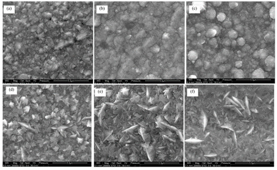 Surface morphology of coatings with different cobalt contents: (a) 2.5%; (b) 19.4%; (c) 39.6%; (d) 54.9%; (e) 71.9%; (f) 79.2% [91].