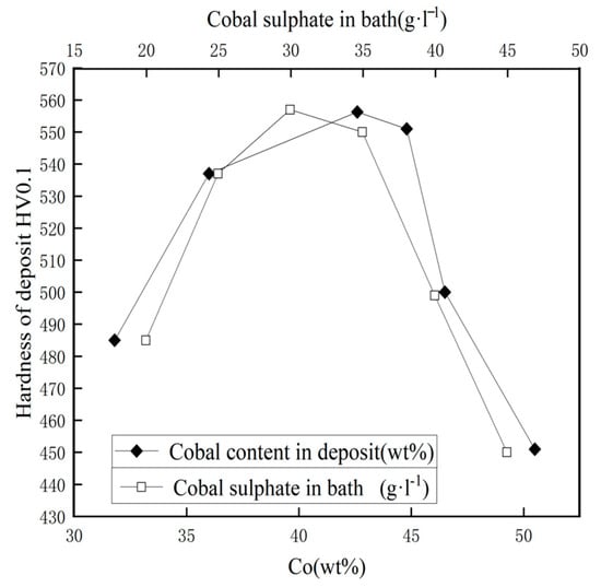 Relationship between the concentration of Co in the plating and sulfate bath and the HV0.1 hardness of the deposited plating [97].