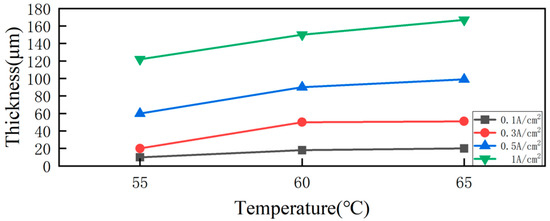 Idris J et al. [108] investigated nickel–cobalt alloy coating electroplating in a Watts-type solution system, focusing on how temperature influences the deposited layer’s properties. The results showed that the thickness of the plated layer increased with higher plating temperatures, as depicted in Figure 7. This is due to the fact that elevated temperatures promote grain growth within the coating. Higher temperatures enhance the mobility of ions and atoms, which encourages larger grain formation and consequently leads to a thicker plating layer. Thus, the observed increase in the layer thickness is due to the temperature-driven enhancement of the grain structure during the electrodeposition process.