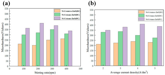 Among many metallic materials, nickel (Ni) was initially widely used in the stainless-steel field and alloy steel because of its good corrosion resistance and high-temperature resistance. With the development of technology, the application areas of Ni are constantly expanding, for example, in the field of electroplating, by covering steel or other metal substrates with a layer of nickel plating, so as to improve its corrosion resistance; in the field of non-silicon MEMS materials, nickel (Ni) is one of the most commonly used materials in a variety of structural applications, primarily owing to the well-established and effective methods available for its electrodeposition, its efficient microfabrication process, its low-temperature process compatibility with the post-CMOS (complementary metal–oxide–semiconductor) process, and its excellent mechanical properties, making it a preferred material in numerous industrial applications. It has found extensive use in a range of typical process systems, such as LIGA/UV-LIGA, EFAB (electrochemical fabrication), and Metal-MUMPS (Metal Multi-User MEMS Processes) [1,2,3,4,5,6]. However, due to the rapid development of various industries, there are now higher standards for all aspects of material performance, and pure nickel materials are no longer capable of meeting the current material needs of many industries. Therefore, the nickel matrix composites prepared by adding metals [7,8,9,10], metal oxides [11,12,13], or non-metals [14,15,16,17] with excellent properties (such as high strength and hardness, corrosion resistance, and wear resistance, etc.) have been widely noticed and greatly developed.